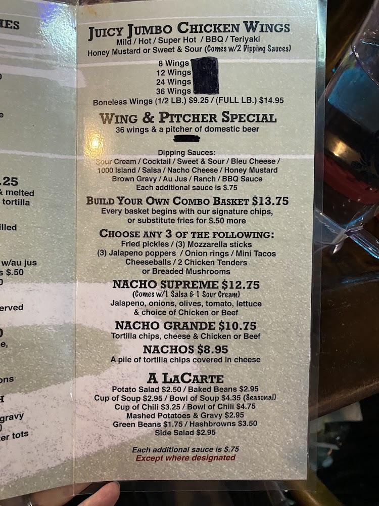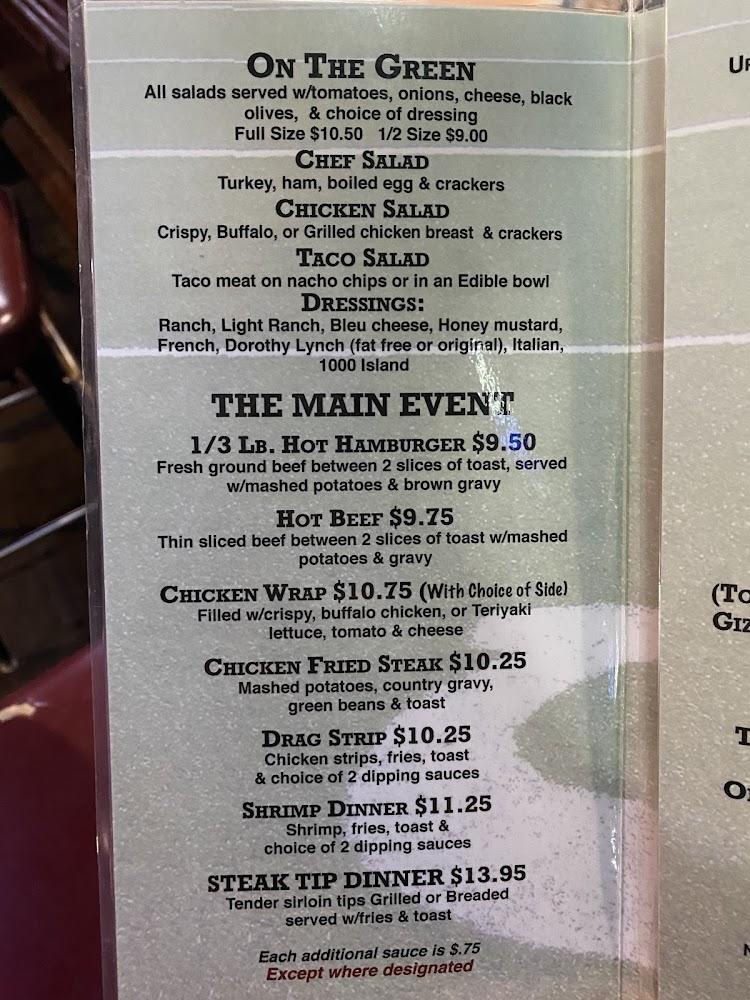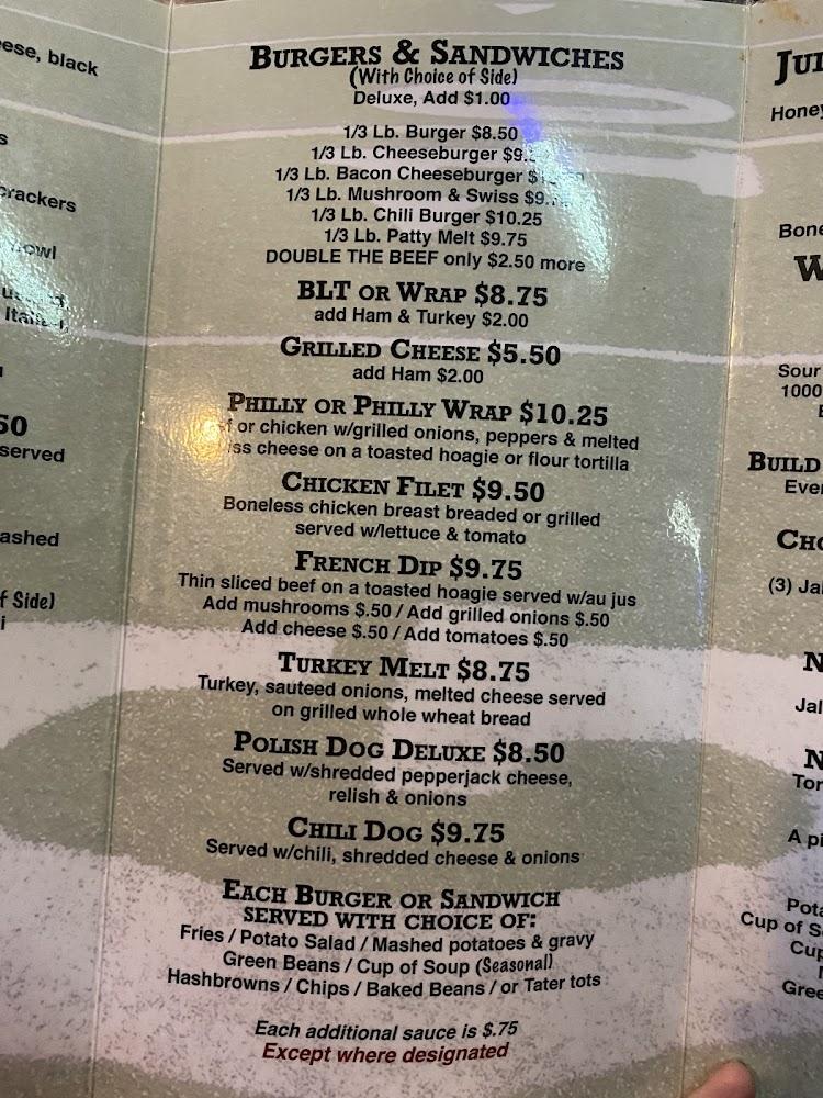 Salads such as the chef salad offer lighter options, while hearty entrees satisfy robust appetites. The menu also includes sides like potato salad and baked beans, enhancing the main dishes. Overall, it caters to diverse tastes while providing a quintessential bar and grill experience.